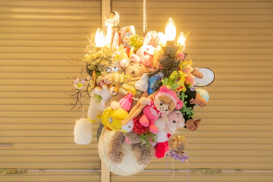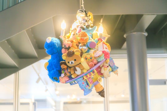 不要になったぬいぐるみやおもちゃを用いて制作されたシャンデリアを通して、人間の姿を光として映し出していきます。