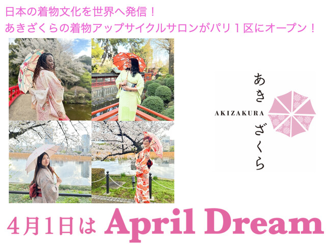 当社は、4月1日を夢を発信する日にしようとするApril Dreamに賛同しています。このプレスリリースは「あきざくら」の夢です。職人の手で日本に眠っている着物を傘や扇子などに仕立て直すサービスを提供し、更にインバウンド向けにその傘を使った着物体験ツアーを提供している、着物のアップサイクルブランド【あきざくら】はこのたび、着物の着付け体験と共に、着付け体験した着物を日常使えるものに仕立て直して提供するサロンをパリ1区にオープンするプロジェクトを始動します。