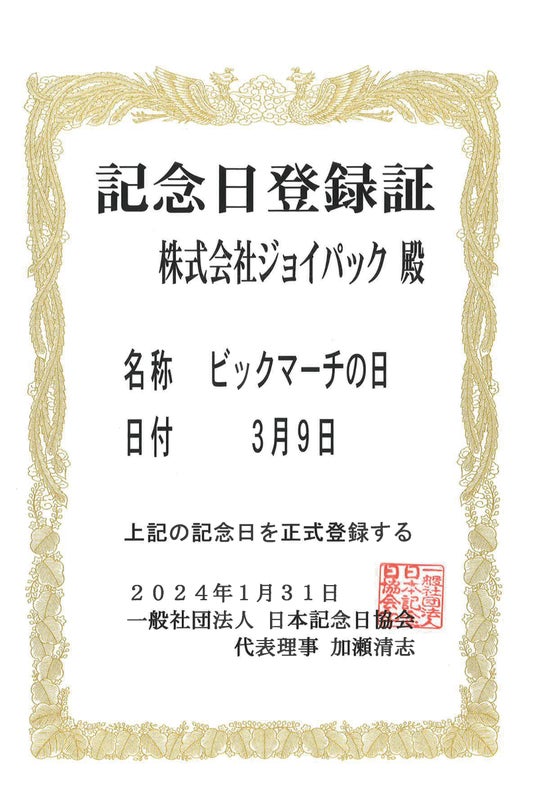 一般社団法人「日本記念日協会」発行の「ビックマーチの日」記念日登録証