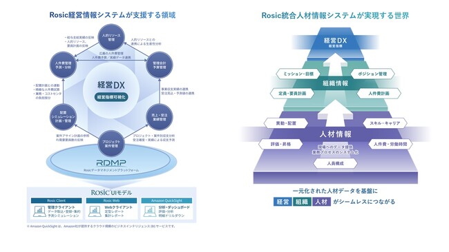 2022年には、長年持ち続けてきた「人材情報が、真の経営情報として、経営やビジネストップの意思決定に有効に活用されていない」という課題意識から、RDMPをベースにRosic人材マネジメントシステムを、「Rosic経営情報システム」と「Rosic統合人材情報システム」の、2つの方向に発展させることになりました。いずれも、Rosicを、「企業における重要な意思決定の支援を強力に支援するシステム」に発展させていくために、重要な役割を担っていくアプリケーションです。