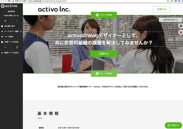 閲覧数国内No.1のボランティア募集情報サイト「activo」(当サイト)を運営する株式会社activo(本社:京都府京都市・代表取締役:小澤佳祐、以下当社)は、この度、NPO団体向けにウェブページ作成機能(β版)の提供を開始いたします。直感的な操作だけでウェブページが作成可能です。