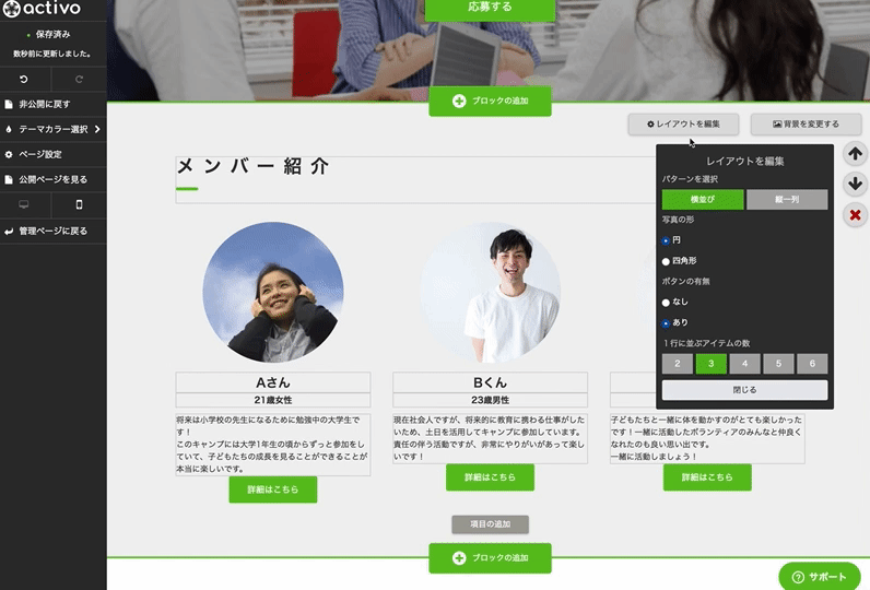 さらに、作成後のページに対し、独自ドメイン利用やメインカラー/団体ロゴ変更など、団体ブランドを表現したり、非営利組織に特化した「メンバー紹介ブロック」「活動紹介ブロック」などの項目をページ内の好きな位置に挿入したりすることが可能です。