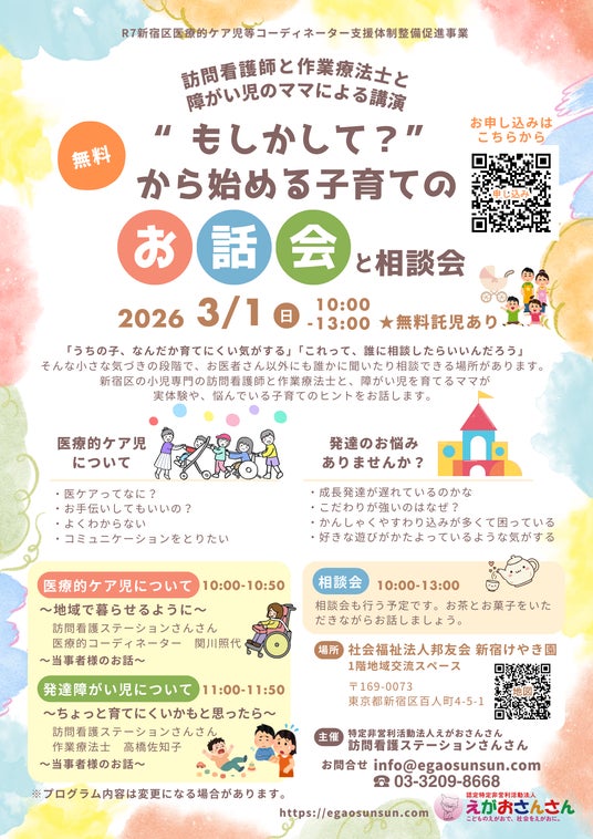 新宿区の小児専門の訪問看護師・作業療法士と、障がいのあるお子さんを育てる保護者が登壇し、実体験を交えながら子育ての悩みやヒントをお伝えします。障がいの有無にかかわらず、子育て中の方にとって参考となる内容です。