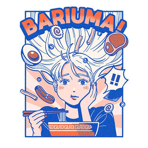 グランプリを受賞したのは、「BARIUMA!」と題した"しろさきさん"による作品。福岡の食文化を伝えたい!という思いから博多弁で「とてもおいしい」という意味の「ばりうま」という方言と、豚骨ラーメンをモチーフにデザイン。女の子の髪をラーメンの麺に見立て、食べた瞬間の舞い上がってしまうほどのおいしさを表現、イラストは海外の方にも興味を持ってもらえそうな日本のマンガやサブカルチャー感が出ています。