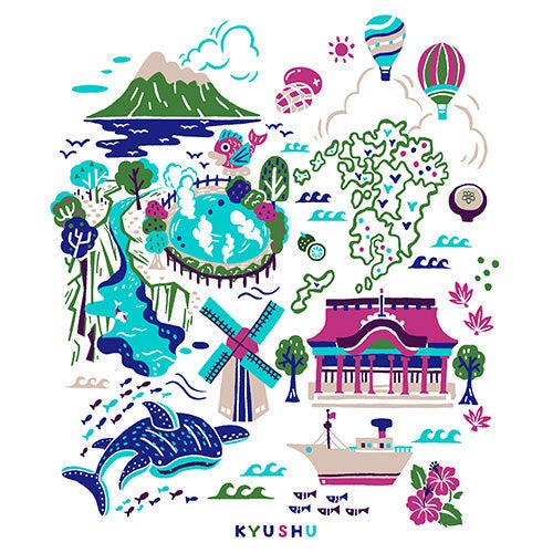 九州にゆかりのある名産物や観光地を、手描きイラストレーションと日本らしい配色で表現したデザインです。