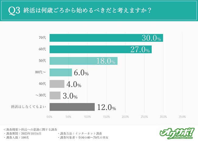 「終活をしなくてもよい」と回答した方は、12%にとどまったことから、多くの方は今後終活を始めるべきだと考えていることと、60代以上で始めるべきだと考えている方が6割以上いることがわかりました。