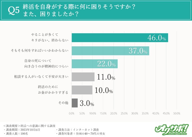 続いて、終活を行ううえで困りそうなことについて伺ったところ、「やることが多くてキリがない、終わらない(46%)」「そもそも何をすればいいかわからない(37%)」という結果となりました。