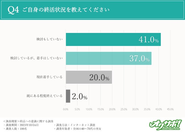 一方で、「検討しているが、着手はしていない(37%)」「現在着手している(20%)」「既にある程度終えている(2%)」と回答した方もいたことから、40代以上の方の半数以上は何らかのアクションを起こしている様子が伝わる結果となりました。