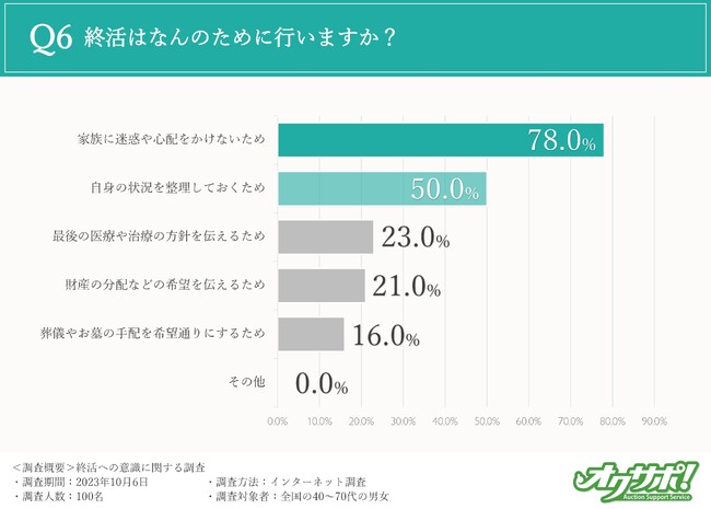 最後に、なんのために終活を行うのかについて伺ったところ、「家族に迷惑や心配をかけないため(78%)」という回答が圧倒的に多い結果となりました。