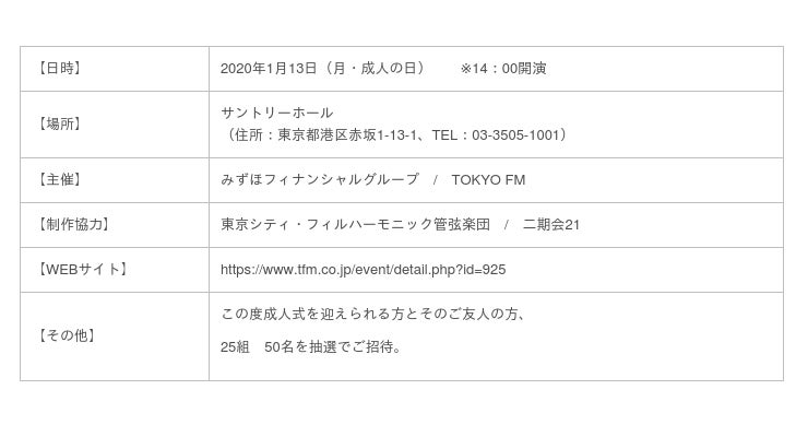 株式会社みずほフィナンシャルグループは、この度、2020年1月13日(月・成人の日)にサントリーホール(東京都港区)で開催する「第31回成人の日コンサート2020」へ、新成人と同伴者、25組50名をご招待します。本コンサートは、若いアーティストの育成支援、次世代を担う青少年へのクラシック音楽普及を目的として開催いたします。