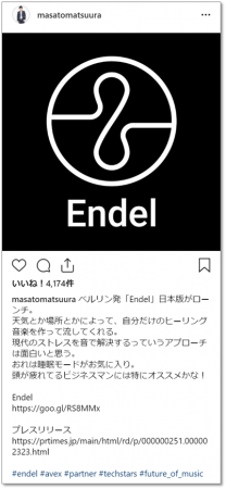 エイベックス株式会社は、海外スタートアップとのオープンイノベーションの一環として、今年8月末付けでEndelへの出資を行いました。Endelのローカルマーケティングパートナーとして、アプリの流通やプロモーションの他、様々な企業とのアライアンス推進などの戦略的コラボレーションを行い、Endelの日本における事業拡大をサポートしていく予定です。