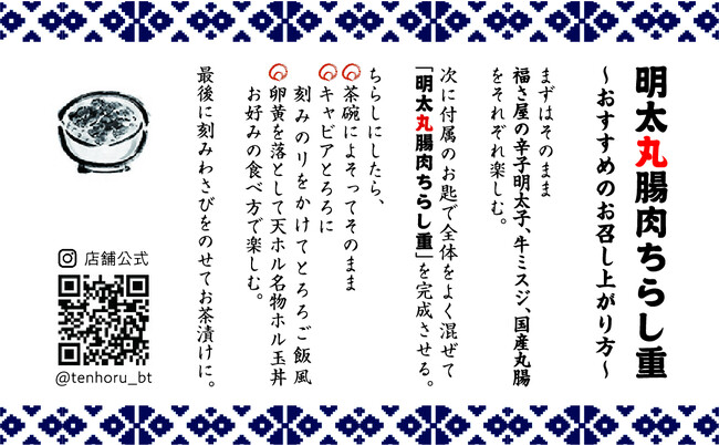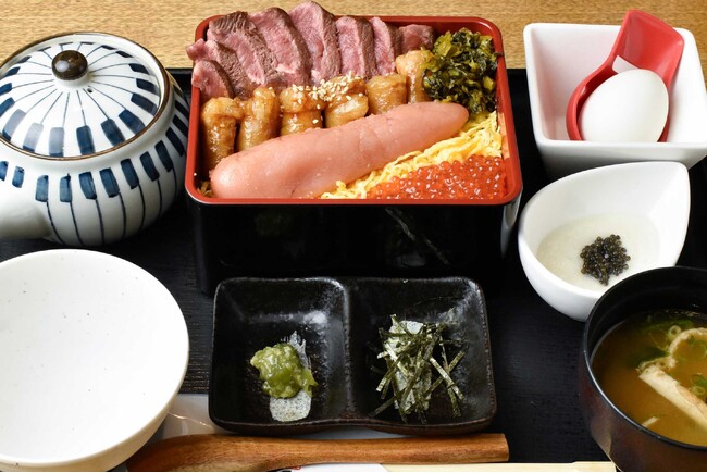 開店を記念し「牛ミスジ」「丸腸」「いくら」「福さ屋謹製辛子明太子を丸ごと1腹」等を使用した『明太丸腸肉ちらし重』(2,780円税込)をオープン日から13日まで1週間の期間限定でご提供致します。