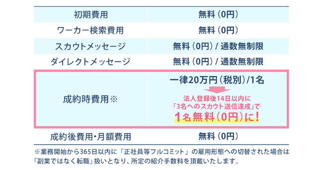 法人登録後14日以内に「3名へのスカウト送信達成」で、1名分の成約時費用が0円になります!