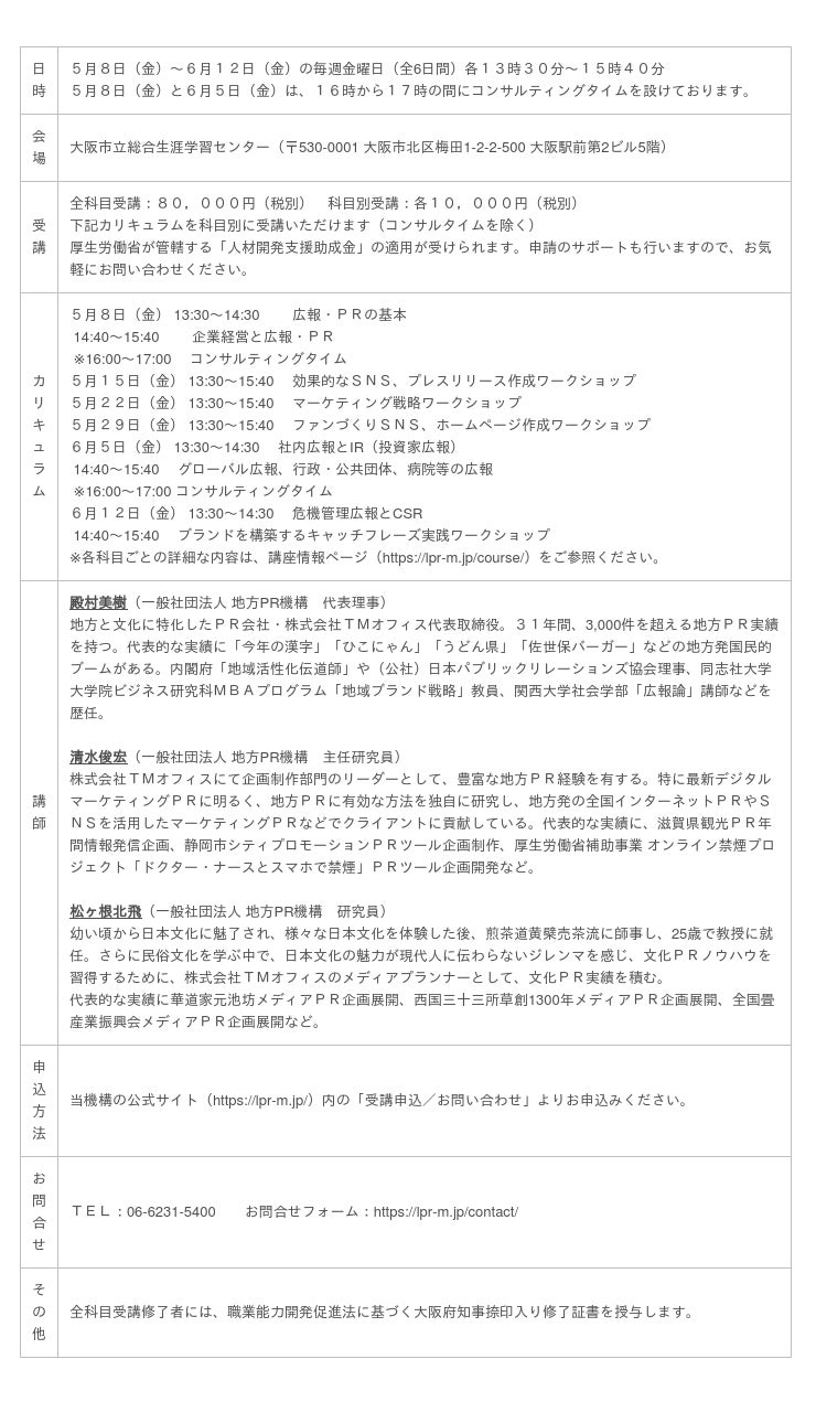 地方のPR力向上への寄与を目指す一般社団法人 地方PR機構(本部:大阪市中央区/代表理事:殿村美樹)は、5月8日(金)から、『広報PR基礎講座』(第4期)を、大阪市立総合生涯学習センターにて開講いたします。
