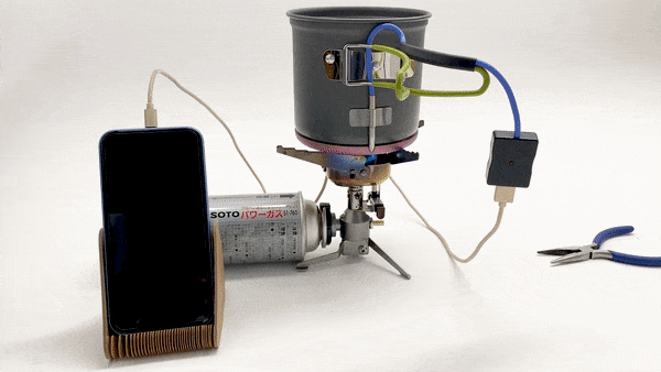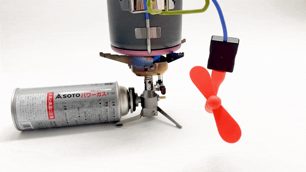 このように加熱することで本体にあるペルチェ素子が電気を作ります。そしてスマートフォン等のデバイスを充電することや扇風機を回すことが可能です。