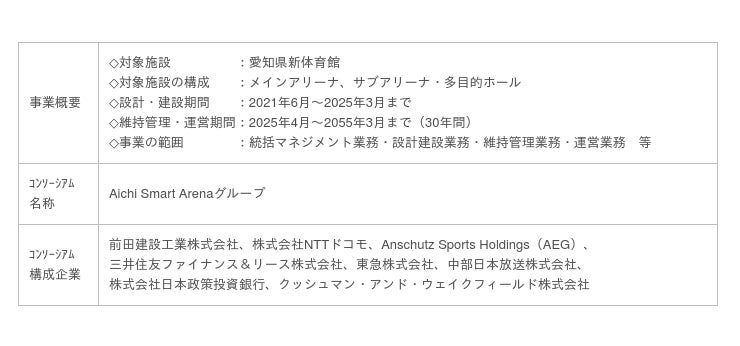 昨年来、当グループは、国内構成企業各社と世界最大のスポーツ&ライブエンターテイメント会社のシナジーを活かすことで、新たな事業モデルの創造と世界最先端のアリーナを実現すべく、本件に取組んできました。今後、愛知県との基本協定の締結準備を進めていく予定です。具体的な事業内容等につきましては、愛知県との協議を踏まえ適宜公表して参ります。