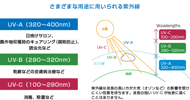 太陽からの日射は、波長により赤外線・可視光線・紫外線(UV)に分けられ、UVの中でも100~290nmの波長を持つものがUV-Cと呼ばれます。UVは人の目に見えず直接浴びると生物に有害ではありますが、生活の様々な場面に有効活用されています。UV-Cの直接照射には空気中や物体表面に付着した細菌およびウイルスなどを形成するDNA等を破壊し除菌する効果があることは古くから知られており、世界的にも多くの実績があります。