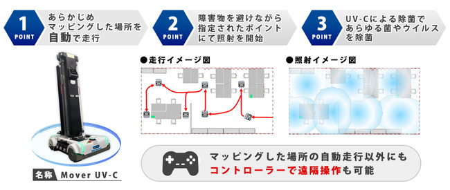 「Mover UV-C」は、無人環境下でUV-C直接照射による除菌作業を予め行うマッピングにより完全自動運転で行います。マッピング時と違う障害物の存在も検知して避けながら移動し、万が一人間が作業空間に立ち入った場合でも人感センサーにより感知して照射を停止、人がいなくなったら所定の時間後に自動で照射作業を再開します。