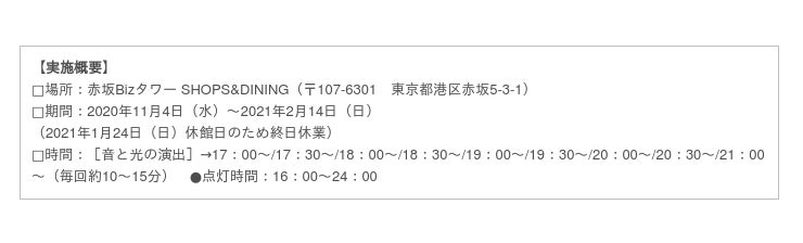 冬の風物詩として人気を集めてきたイルミネーションは、さらなる発展を目指す「赤坂サカス」と同じように今年も空高く輝き続けていきます。赤坂サカスのイルミネーション「赤坂サカス 音×テラス2020-2021」とともに、東京タワーとコラボした「豪華プレゼントキャンペーン」を貴誌(紙)にて是非ご紹介くださいますようお願い申し上げます。
