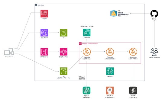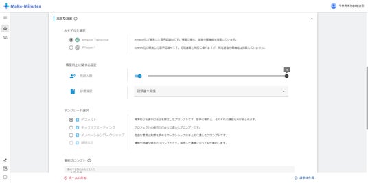 Make-Minutesでは要約に利用しているGPT-4oにはOpenAI APIを、その他のモデルついてはAWS Bedrockを経由しており、音声認識モデルは、Amazon TranscribeかWhisperを利用者が選べるようになっています。前者を選ぶと話者分離が可能で、後者だと話者分離はできないですが認識精度が高く、処理速度も速いです。例えば1時間の音声ファイルなら、Amazon Transcribeだと15~18分、Whisperだと約3分ほどで文字起こしが作成されます。