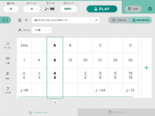 練習する楽曲にリンクした拍子・テンポ変化の設定が可能。