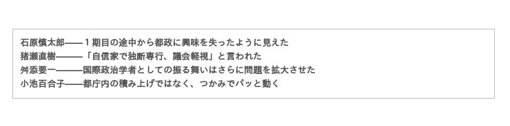 なぜ来てほしいのか/幕引きは忘れた頃に/外野知事/舛添流と石原流/「せこい劇場」の根っこ