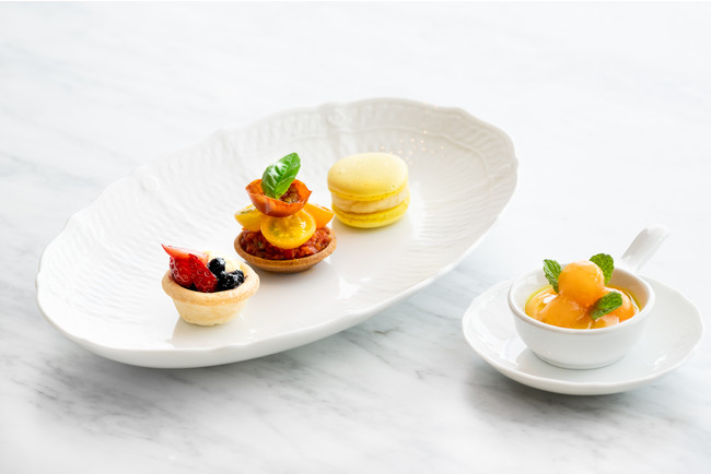最初の一皿は、夏の北海道の清涼感を感じさせるセイボリー 4種類をご用意。北海道産とうもろこしのマカロン、色鮮やかなペティトマトをトッピングしたバニラショートブレッド、ブルーベリーをバルサミコ酢でコンポートしたタルト、オリーブオイルやミントでさっぱりと仕上げた北海道産メロンなど、夏の彩が口いっぱいに広がります。続いて提供されるピエール・エルメ・パリの焼きたてスコーンには、自家製のジャムとダブルクリームの相性が抜群。ホテルのガーデンから摘みたての香り高いオリジナルハーブティーとご一緒にお楽しみください。