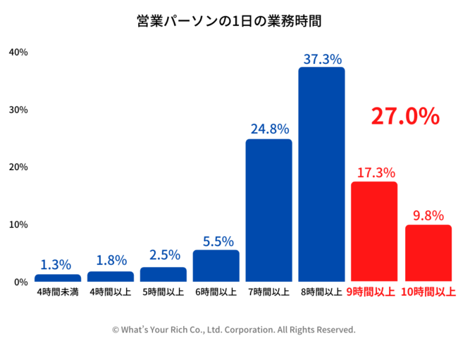 1日あたりの業務時間を問う質問に対して、27.0%の営業パーソンが1日あたりの業務時間が9時間を超えていると回答しました。4人に1人以上が、1日の法定労働時間8時間を超過した長時間労働になってしまっている現状が浮き彫りになりました。