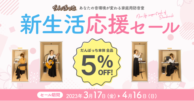 4月16日(日)まで、新生活応援セールを実施中!シリーズ4製品が5%OFFで購入できます。深夜の音漏れが気になる方、趣味をもっと自由に楽しみたい方、家庭用防音室だんぼっち、この機会にぜひご検討ください。【販売サイト】