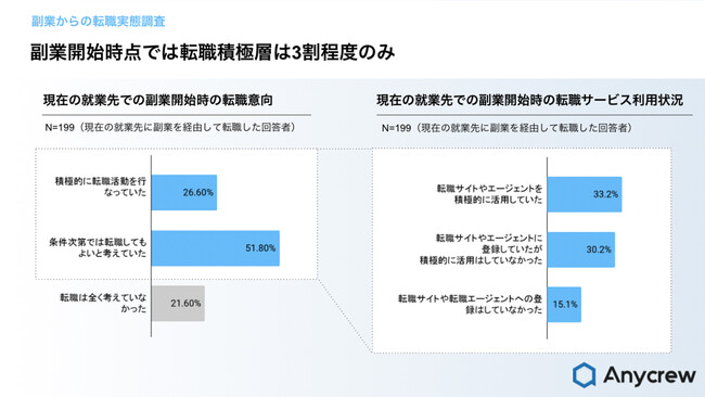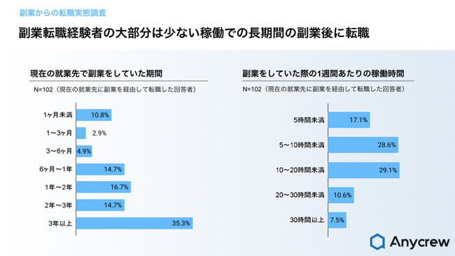 フリーランス・副業人材と企業とのマッチングプラットフォーム「Anycrew」を提供するエニィクルー株式会社(本社:東京都新宿区、代表取締役:赤羽貢)は、『副業からの転職実態調査』と題し、副業先に転職をした転職者へのアンケート調査を実施しました。また、調査結果をもとに副業からの採用を成功させるための求人企業向けのポイントをまとめた資料を公開しています。