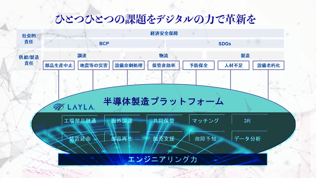 日本の半導体工場数は世界で最も多いものの、多くの工場は機械装置が老朽化が進んでおります。一方で、老朽化した機械装置は現役で現在でも稼働しつづけており、様々な課題が山積しています。当社ではデジタル化とエンジニアリングの両面からお客様(半導体工場)にサービスを提供しております。今後、半導体製造に関わる調達・物流・製造領域におけるサプライチェーンを半導体工場とサプライヤー、半導体工場とエンジニアといった異なるグループや要素を仲介し結びつけることで強化することで、日本のものづくりの復権を支え、経済安全保障の一躍を担うべき事業を展開して参ります。