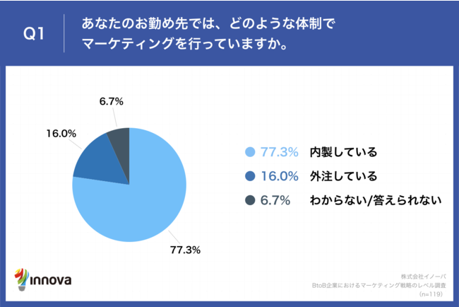 「Q1.あなたのお勤め先では、どのような体制でマーケティングを行っていますか。」(n=119)と質問したところ、「内製している」が77.3%、「外注している」が16.0%という回答となりました。