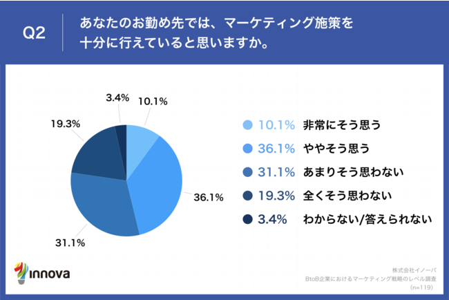 「Q2.あなたのお勤め先では、マーケティング施策を十分に行えていると思いますか。」(n=119)と質問したところ、「あまりそう思わない」が31.1%、「全くそう思わない」が19.3%という回答となりました。