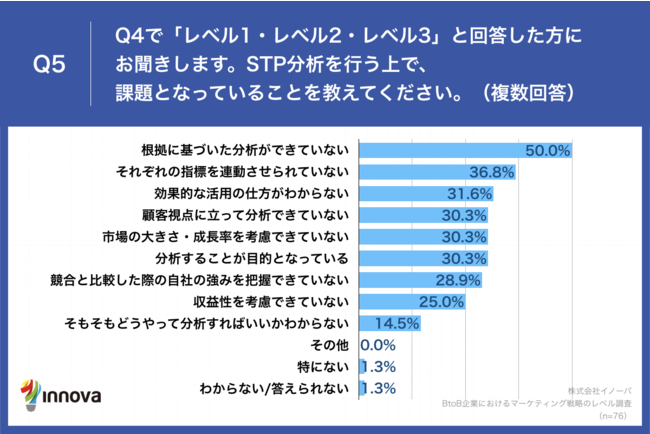 Q4で「レベル1・レベル2・レベル3」と回答した方に、「Q5.STP分析を行う上で、課題となっていることを教えてください。(複数回答)」(n=76)と質問したところ、「根拠に基づいた分析ができていない」が50.0%、「それぞれの指標を連動させられていない」が36.8%、「効果的な活用の仕方がわからない」が31.6%という回答となりました。