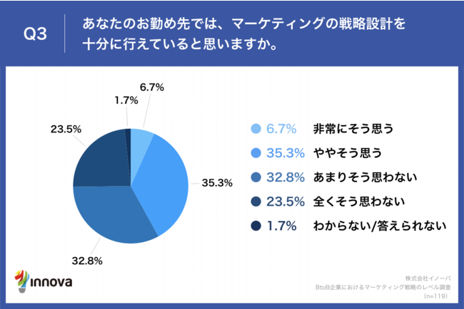 「Q3.あなたのお勤め先では、マーケティングの戦略設計を十分に行えていると思いますか。」(n=119)と質問したところ、「あまりそう思わない」が32.8%、「全くそう思わない」が23.5%という回答となりました。