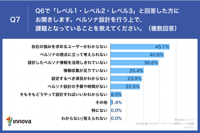 Q6で「レベル1・レベル2・レベル3」と回答した方に、「Q7.ペルソナ設計を行う上で、課題となっていることを教えてください。(複数回答)」(n=71)と質問したところ、「自社の強みを求めるユーザーがわからない」が45.1%、「ペルソナの視点に立って考えられない」が40.8%、「設計したペルソナ情報を活用しきれていない」が36.6%という回答となりました。