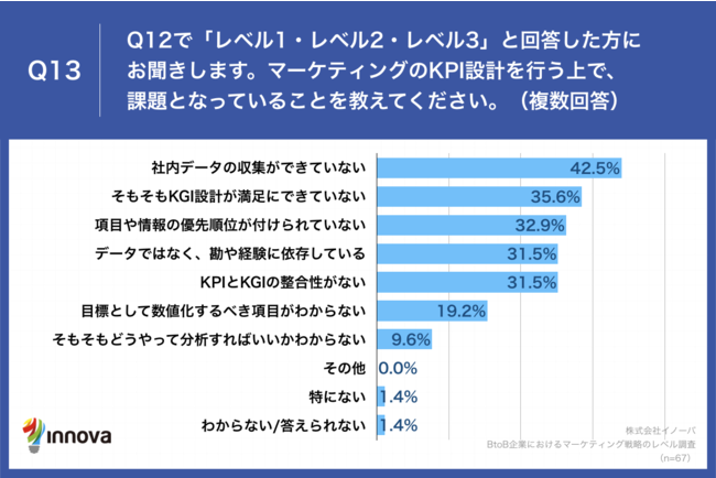 Q12で「レベル1・レベル2・レベル3」と回答した方に、「Q13.マーケティングのKPI設計を行う上で、課題となっていることを教えてください。(複数回答)」(n=73)と質問したところ、「社内データの収集ができていない」が42.5%、「そもそもKGI設計が満足にできていない」が35.6%、「項目や情報の優先順位が付けられていない」が32.9%という回答となりました。
