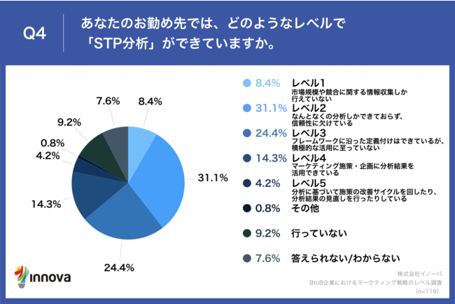 「Q4.あなたのお勤め先では、どのようなレベルで「STP分析」ができていますか。」(n=119)と質問したところ、「レベル3|フレームワークに沿った定義付けはできているが、積極的な活用に至っていない」が24.4%、「レベル2|なんとなくの分析しかできておらず、信頼性に欠けている」が31.1%という回答となりました。