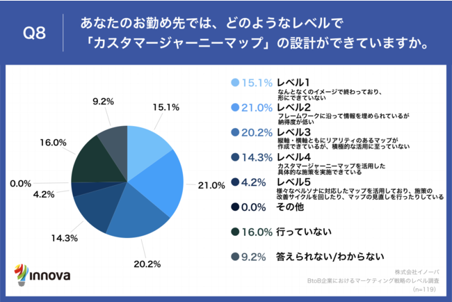 「Q8.あなたのお勤め先では、どのようなレベルで「カスタマージャーニーマップ」の設計ができていますか。」(n=119)と質問したところ、「レベル3|縦軸・横軸ともにリアリティのあるマップが作成できているが、積極的な活用に至っていない」が20.2%、「レベル2|フレームワークに沿って情報を埋められているが納得度が低い」が21.0%という回答となりました。