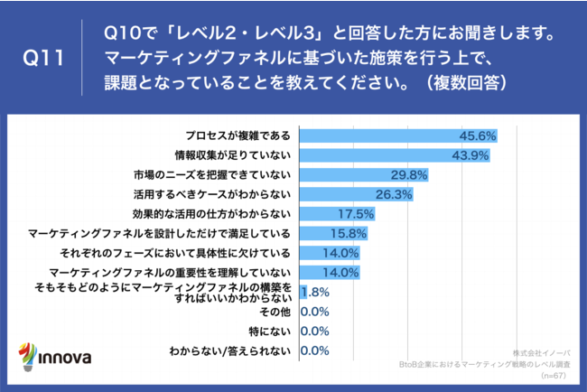 Q10で「レベル2・レベル3」と回答した方に、「Q11.マーケティングファネルに基づいた施策を行う上で、課題となっていることを教えてください。(複数回答)」(n=57)と質問したところ、「プロセスが複雑である」が45.6%、「情報収集が足りていない」が43.9%、「市場のニーズを把握できていない」が29.8%という回答となりました。