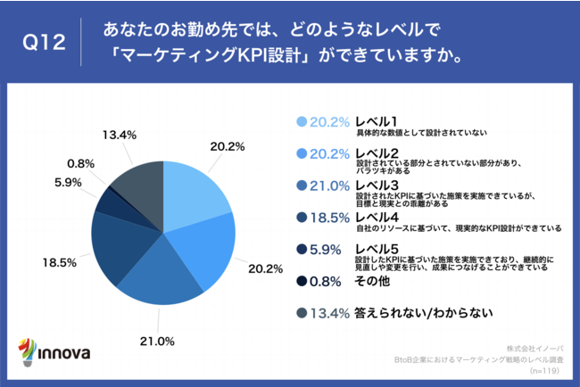 「Q12.あなたのお勤め先では、どのようなレベルで「マーケティングKPI設計」ができていますか。」(n=119)と質問したところ、「レベル1|具体的な数値として設計されていない」が20.2%、「レベル2|設計されている部分とされていない部分があり、バラツキがある」が20.2%という回答となりました。