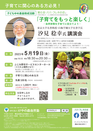 汐見稔幸氏講演会は「子育てをもっと楽しく」を掲げ、自然体験を子育てに役立てようを主題として