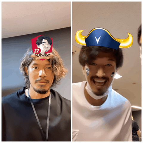 画面を押すと、頭の上にヴィッセル神戸の選手たち数名がランダムに回転し始め、一定時間経過と共に確定される仕様になっています。このARエフェクトは、サポーターやご家族ご一緒に最大2人で楽しんでいただけます。