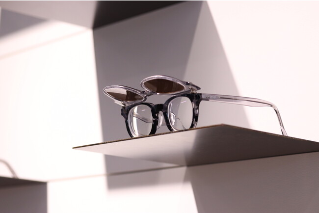 (※3)デザイン性を重視し、分厚い生地を重ね合わせた跳ね上げ型のサングラス兼用眼鏡