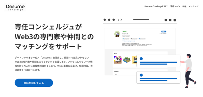 「Desume Concirge」(https://www.concierge.desume.jp/)では、株式会社プロタゴニストの運営するポートフォリオデータベース「Desume」を活用し、他媒体では見つからないWEB3の専門家や仲間とのマッチングを支援します。アクセスしづらい一次情報を持った人材に直接依頼出来ることで、WEB3事業の立上げ、仮説検証、市場調査を円滑に行えます。