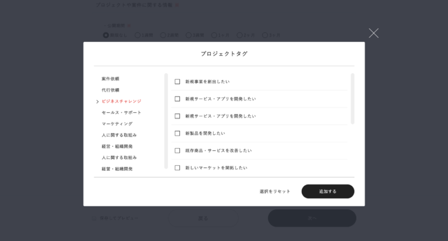 これまでCrewto(R)を運営していくなかで、企業名、社名でチーム登録いただくことが多く、当初想定していた「HRTecの亜種的な位置づけのサービス」よりは、ビジネスマッチング要素が強いという認識を強め、掲載する募集についても求人(人材リソース)だけでなく、案件やプロジェクト、社内の課題やチャレンジしたいことなど、会社運営、事業活動において発生する様々な事柄について、外部リソースを積極活用していこうという概念をサービスに持たせたいと考えビジネスマッチング機能を実装致しました。