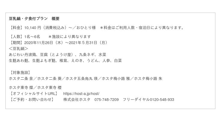 株式会社ホスタ(本社:京都市南区大宮通八条上る大黒町290 代表:東尾浩史)が運営する「一棟貸しの宿・ホスタ」では、京都食材をふんだんに取り入れた豆乳鍋の夕食が付いたプランを2020年11月26日(木)より販売いたします。