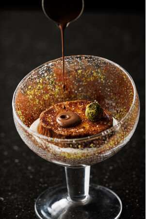 フランス語でフレンチトーストを意味する「パン・ペルデュ」は、今年春に六本木店限定で提供開始したデザートメニューで、多くの反響から第二弾が誕生しました。「パン・ペルデュ・プラリネ・ピスターシュ」は、東京工房で焼き上げる自家製ブリオッシュを卵とミルクのアパレイユに浸し、バターで香ばしくキャラメリゼ。中はしっとり、外はカリッと仕上げたそのブリオッシュをザクザク食感を楽しめる風味豊かなピスタチオのプラリネと生クリームの上に重ね、アクセントにピスタチオトリュフをトッピング。上からカカオ75 %の温かいショコラソースをかけてお楽しみいただきます。