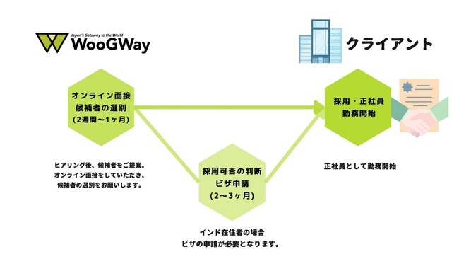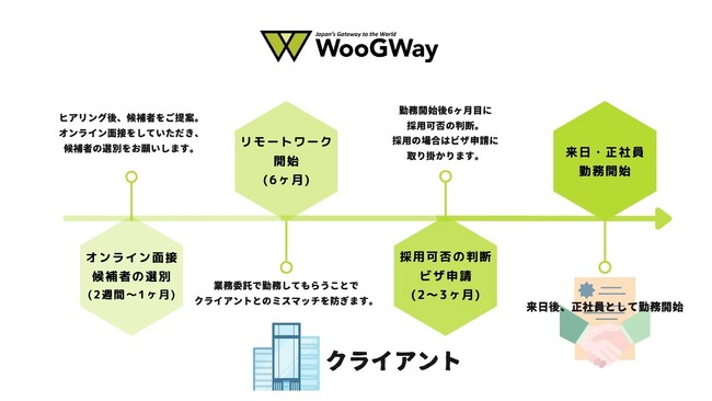 業務委託開始から3~6ヵ月目でその正社員候補者を正社員として雇用するかのご判断をお願いします。採用される場合は、ビザ申請のプロセスとなります(通常ビザ申請~取得まで2~3ヵ月かかる場合がございます)。