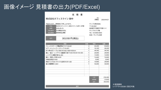 見積書は、用途に応じてPDF/Excel/CSV形式での出力が可能です。社内承認や顧客提出など、業務シーンに合わせて柔軟に活用でき、共有・確認・保存もスムーズに行えます。